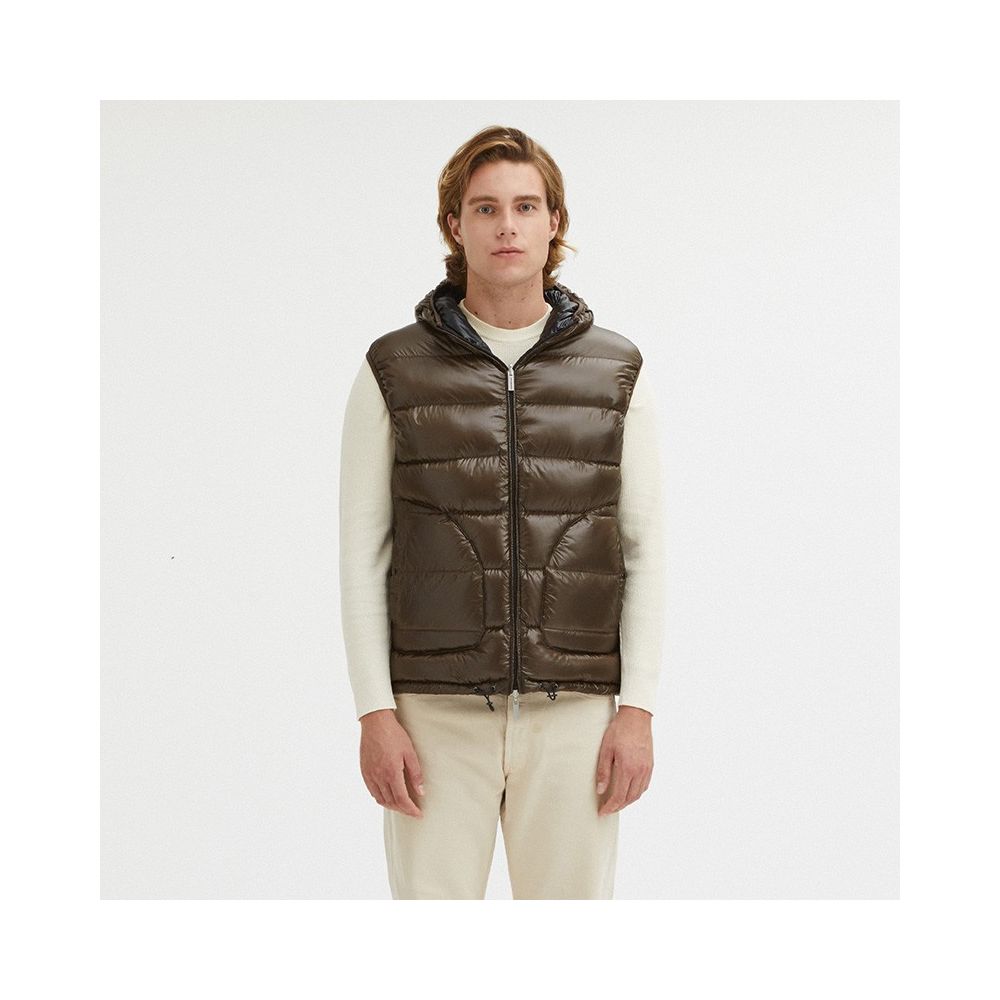 Discover the versatile elegance of our reversible hooded vest from Centogrammi, perfect for any fashion-forward wardrobe. One side flourishes in a classic brown, while the other offers a sleek black, allowing you to switch styles with a simple flip. The vest is padded with plush duck feathers, ensuring warmth and comfort, and features a smooth zip closure for ease of wear.