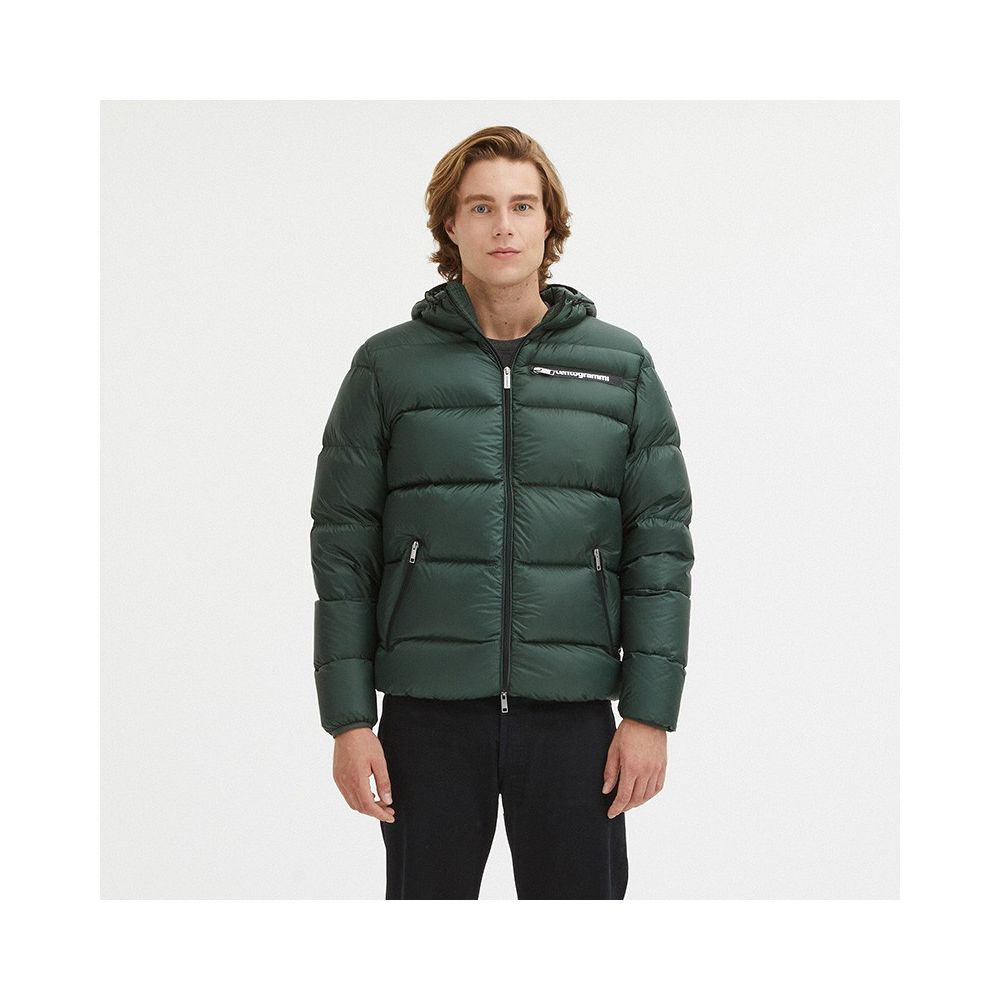 Step into luxury and warmth with this sumptuous Centogrammi hooded jacket. Impeccably crafted with a rich dark green hue, it’s the perfect amalgamation of style and functionality. The jacket features a practical front zip closure and is padded with the finest goose down to keep you cozy in the cold.