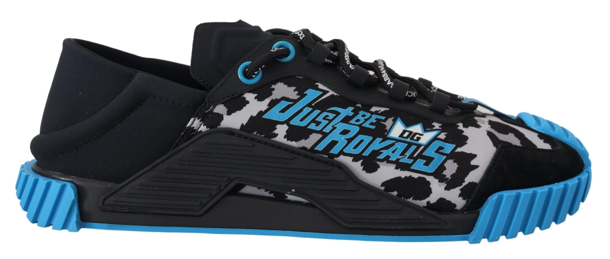 Immerse in the opulence of Dolce & Gabbana with these gorgeous, brand new NS1 sneakers. Crafted with precision in Italy, these shoes define luxury comfort and royal aesthetics, highlighted by the ‘Just Be Royals DG’ motif. The black and blue hues blend seamlessly on the high-quality materials, with a robust rubber sole ensuring durability. A perfect blend of style and practicality, these sneakers are the epitome of upscale fashion for the discerning gentleman.