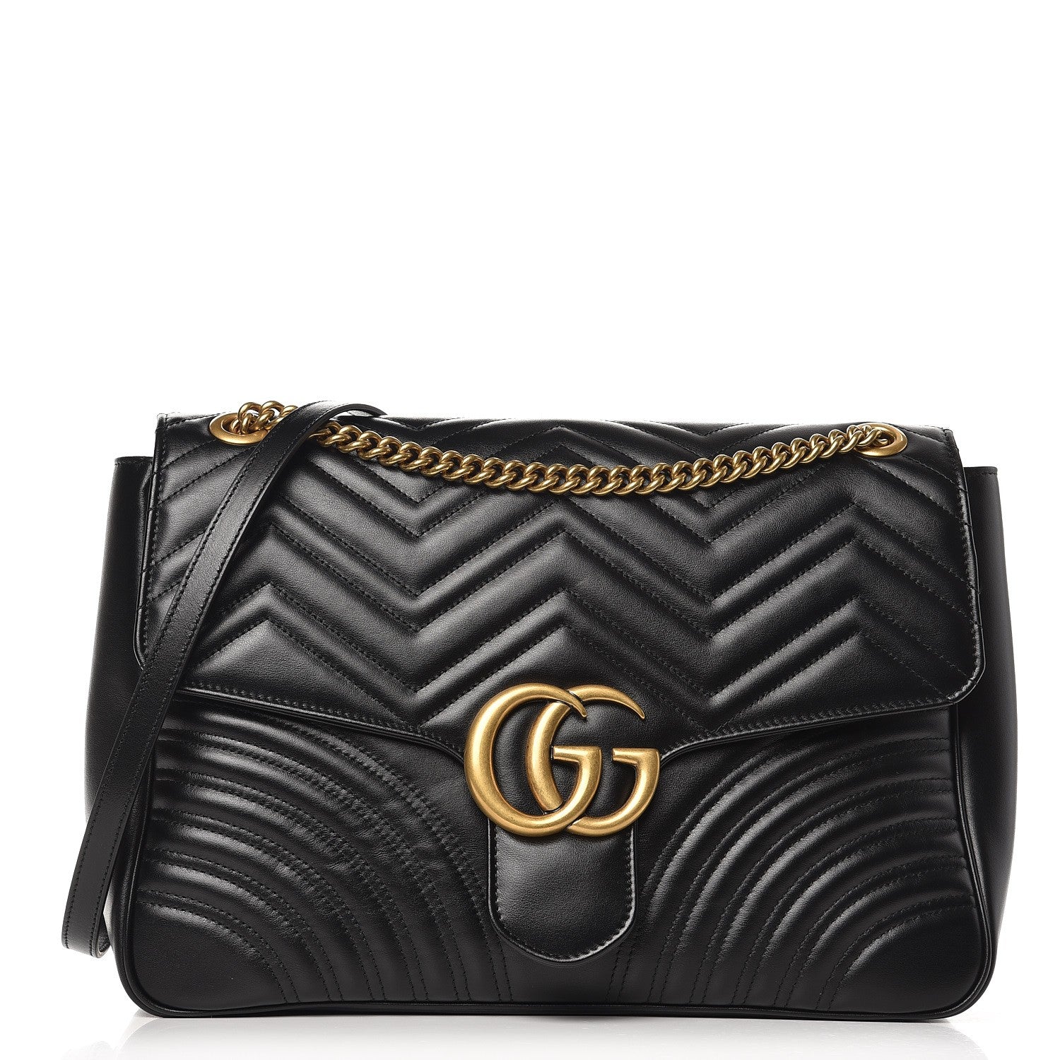 Gucci’s GG Marmont Large shoulder bag has been crafted in Italy from quilted matelassé leather for a chevron finish. The softly structured shape is adorned with the brand’s iconic GG hardware for instant recognition – a signature that really stands out against the stark black leather. Tote your essentials in its suede-lined interior and adjust the sliding chain strap for a longer or shorter drop.