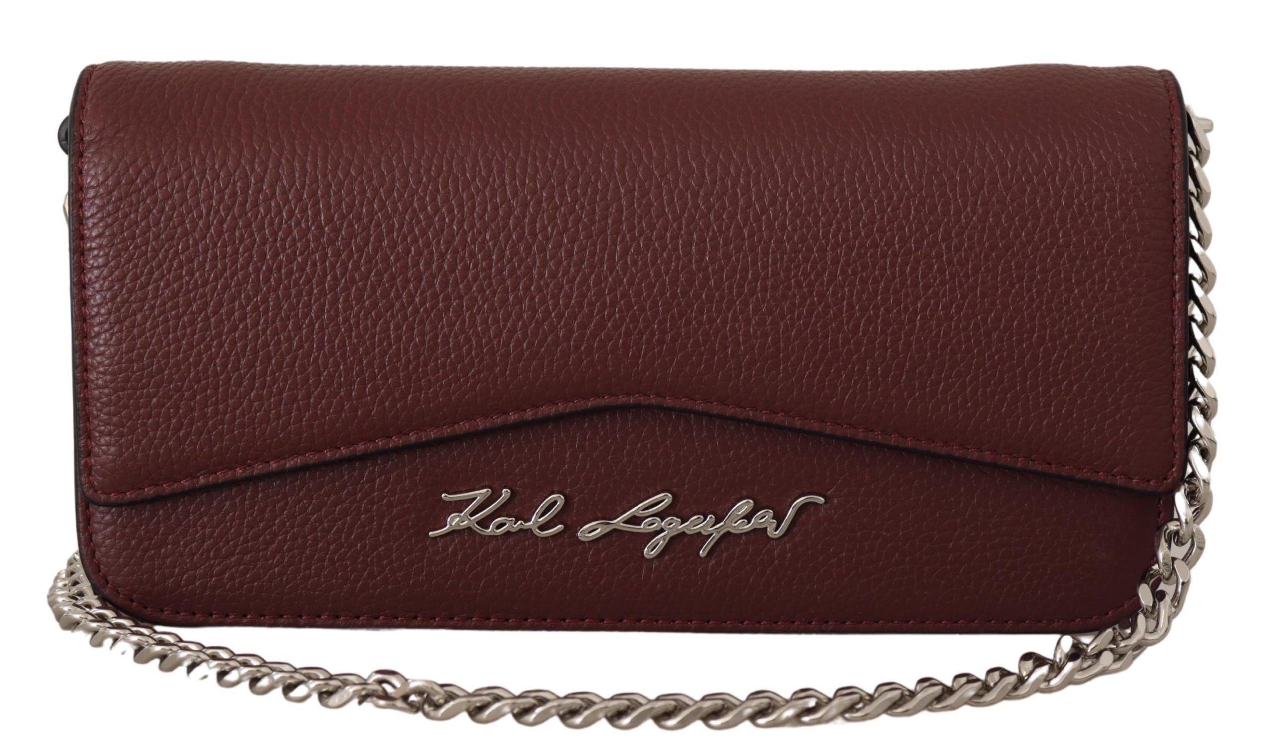 Discover elegance and sophistication with the Karl Lagerfeld Evening Clutch Bag, perfect for complementing your evening attire. Crafted with premium leather in a rich wine hue, this clutch is not just a statement accessory but a versatile piece with practicality in mind. The sleek flap snap closure opens to reveal a single main compartment lined with an interior slip pocket, ensuring all your essentials are secured yet easily accessible. The gleaming silver-toned logo hardware adds a luxe touch, while the accompanying 110cm chain shoulder strap offers the flexibility of shoulder or crossbody wear, marrying convenience with high fashion.