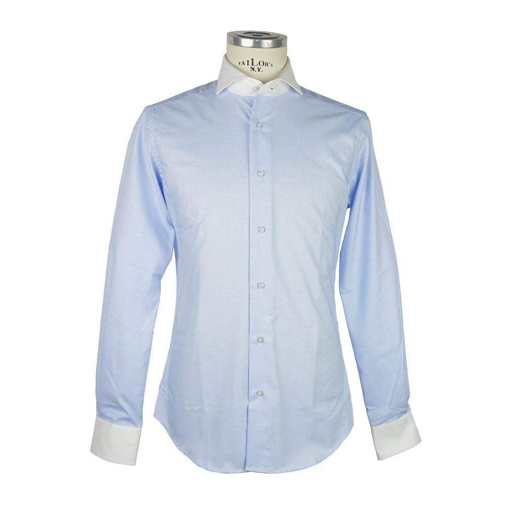Step into sophistication with our ‘Made in Italy’ men’s shirt featuring a standout contrast collar, elegant blue micro squares texture, and pristine white cuffs. Crafted from 100% cotton for your comfort and style.