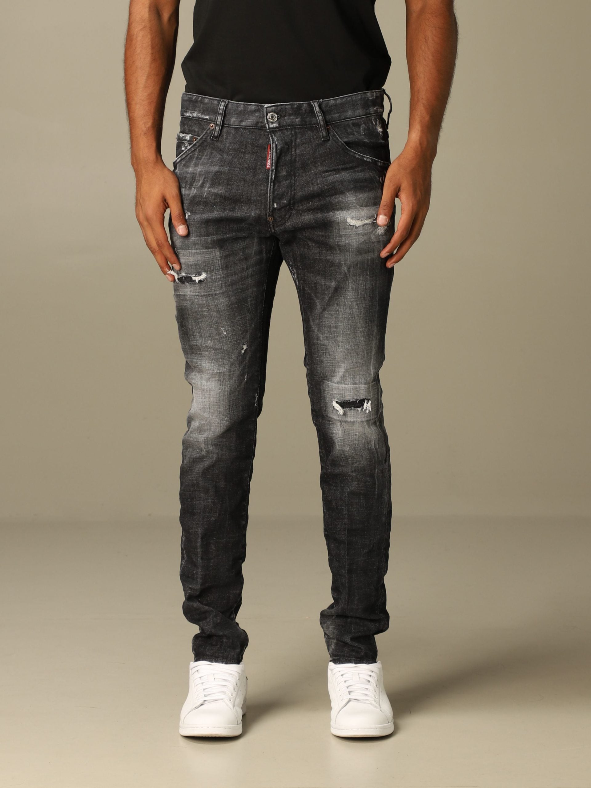 Dsquared2 denim, grey color, buttons closure, 5-pockets design, slim fit, black leather patch on the back.