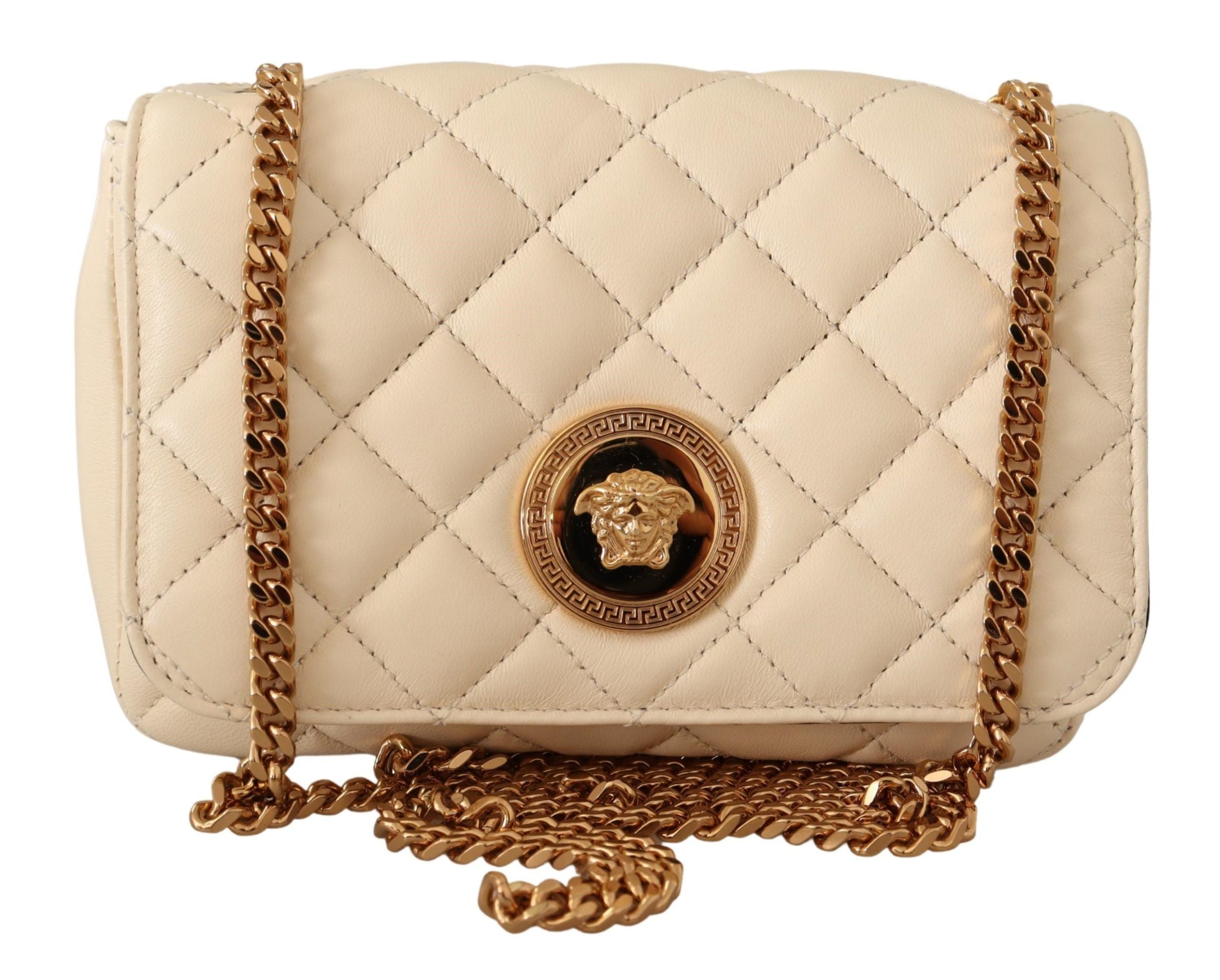Indulge in the luxury and sophistication of a Stunning Versace Crossbody Bag, perfect for the fashion-forward individual seeking both style and practicality. Crafted with exquisite Nappa Leather, this versatile accessory glimmers with its iconic gold-tone Medusa head logo and hardware, seamlessly switching from a daytime shoulder bag to an elegant evening crossbody with its removable chain shoulder strap.