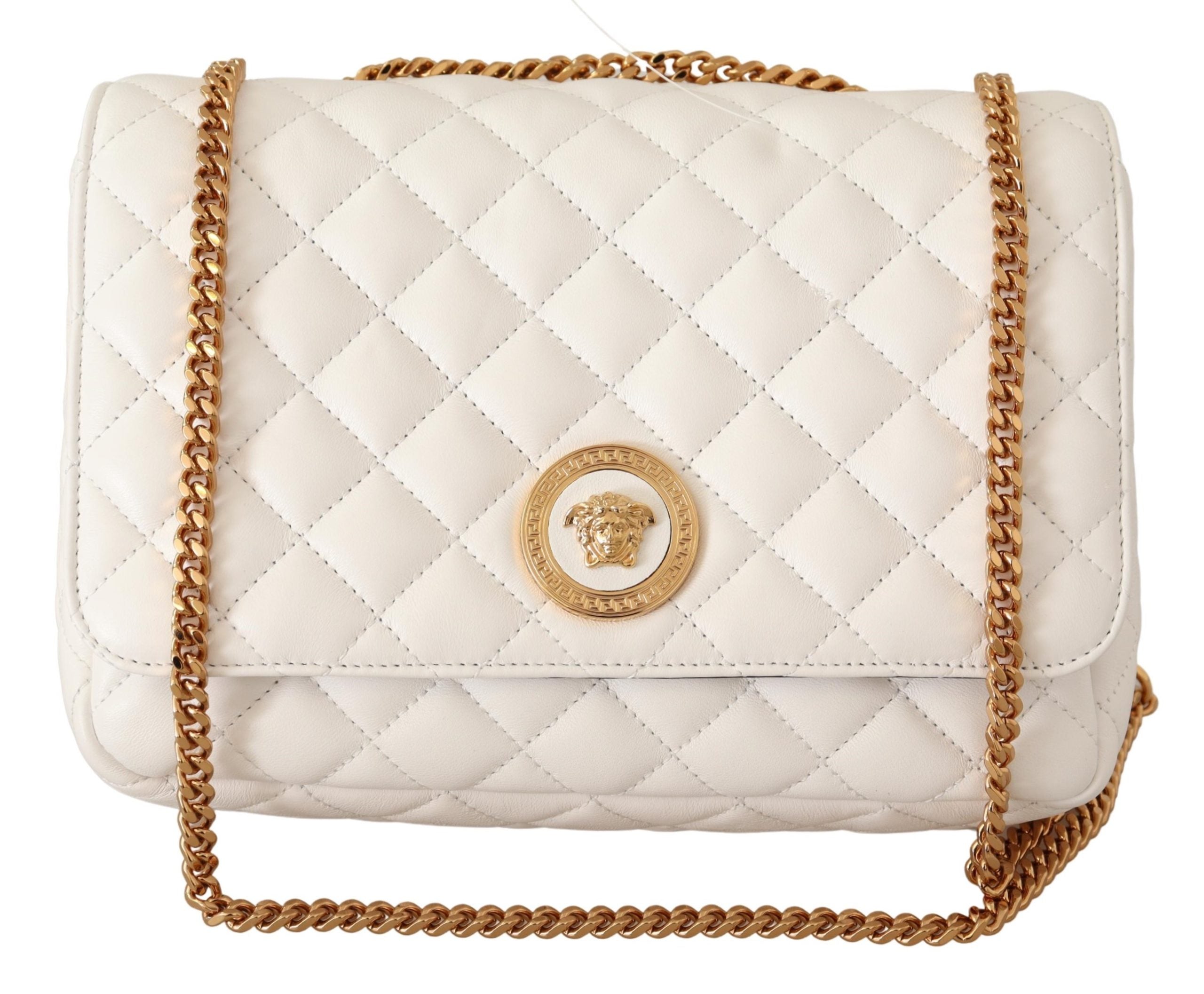 Details: Flap closure, medusa head logo, 1 main compartment, 1 interior patch pocket, a gold-tone hardware and chain shoulder strap for shoulder or crossbody wear.
